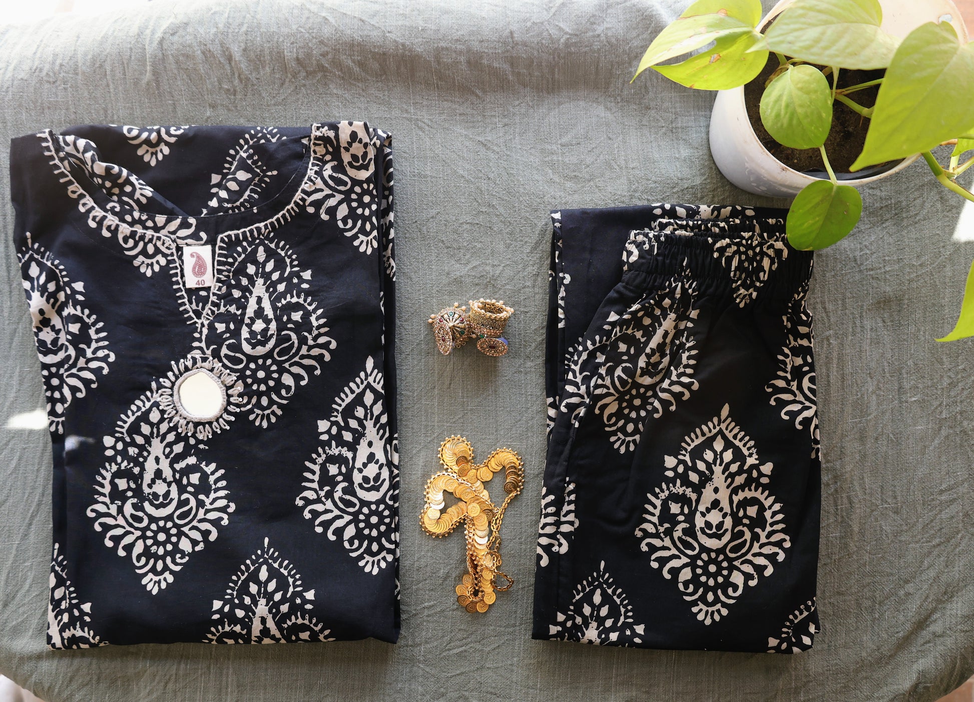 A classic versatile black kurti set paired with the traditional jaipur block print style, makes it a great " Desk-to-Dinner" option.This Straight cut kurti features an intricate all over white paisley block print that create a striking contrast against the black base. It is designed with three quarter sleeves and a flattering notched round neckline. The bottom comes with a matching palazzo in the same signature print and deep side pocket for a seamless, co ordinated look.
