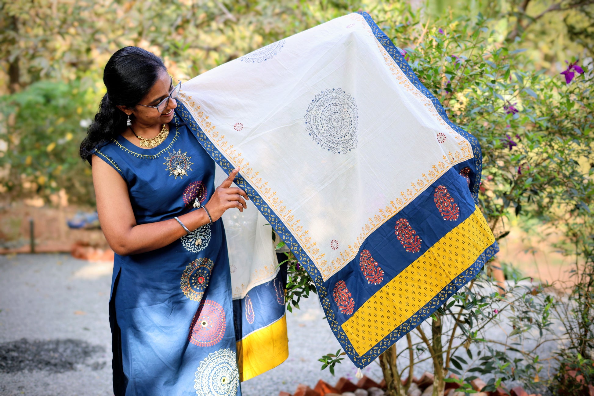 This elegant kurti set combines traditional indian motifs with a modern, breezy silhoutte, making it perfect addition to a contemporary ethnic wardrobe.The front of this sleeveless (sleeves attached) straight cut blue kurti is decorated with large, intricate mandala style circular prints in contrasting cream and rust tone. Its notched round neckline enhanced with a delicate yellow embroidery and charming white sea shell tassels for a touch of bohemian flair.The set is paired with a solid blue palazzo and a light weight off-white dupatta finished with a broad, multi toned border featuring mustard yellow geometric patterns and blue buta motifs. Playful white sea shell tassels adorn the corners.