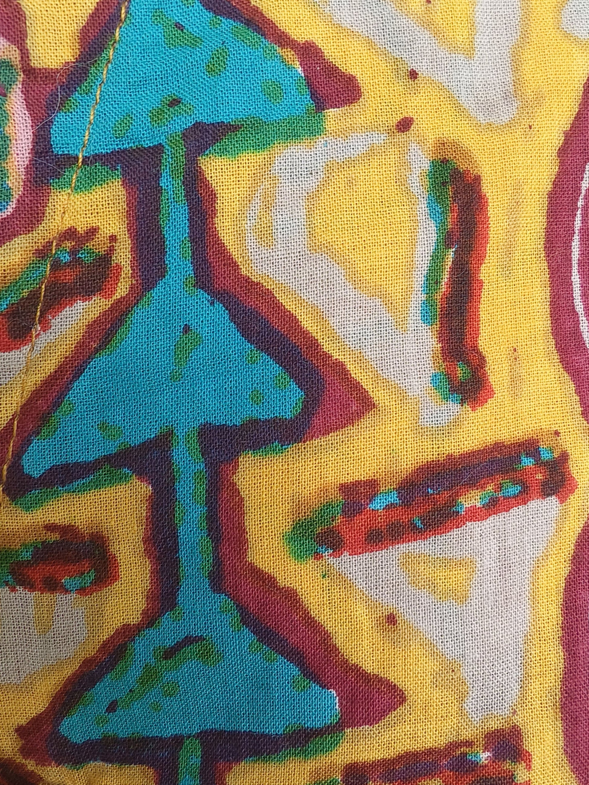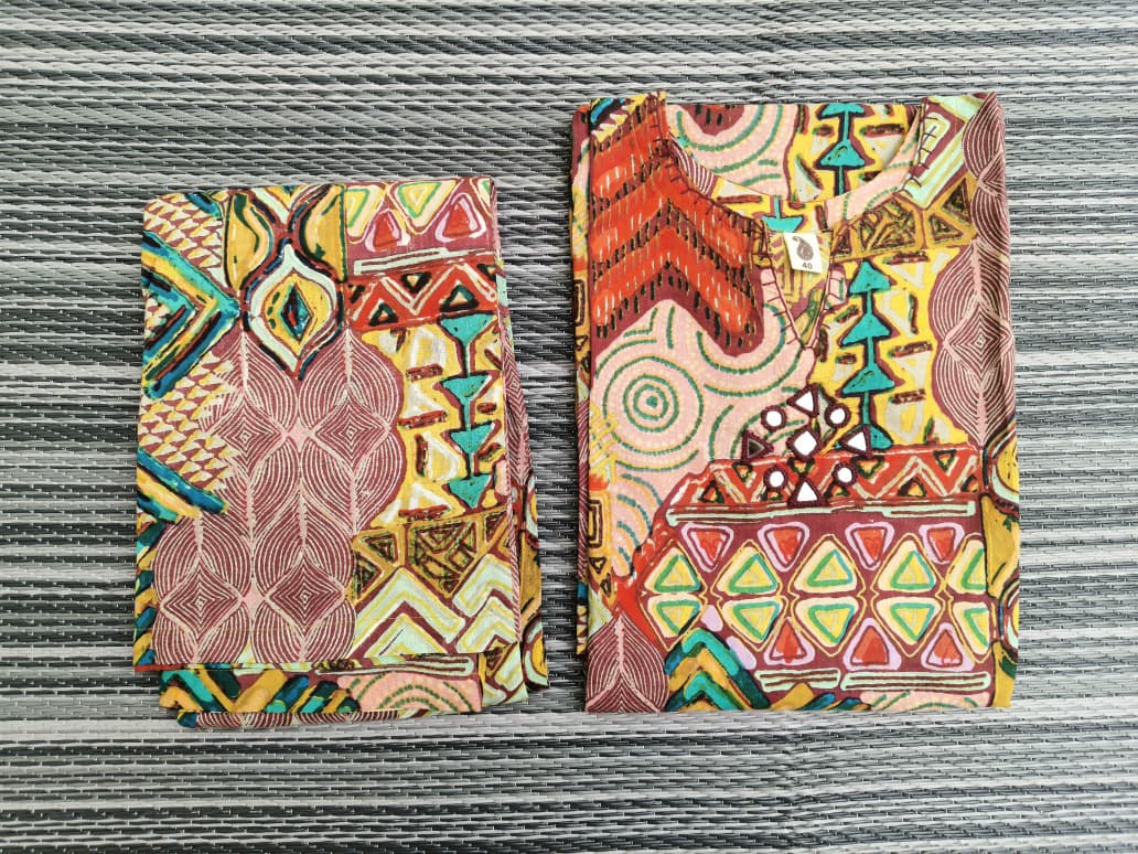 This is a vibrant two piece kurti set featuring a multi-coloured geometric and abstract print.Designed with a notched round neck and three quarter length sleeves.The neck line of the kurti accented with mirror work.The bottom is coordinating straight leg palazzo with elasticated waist band.