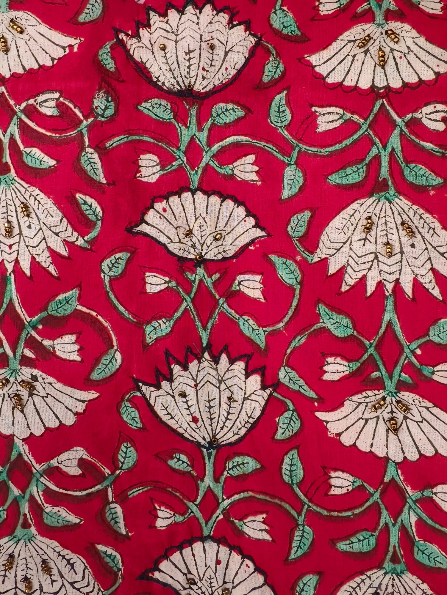 This vibrant crimson red short kurti showcases a classic indo-western fusion, featuring an all-over traditional buti floral motifs created through hand-block printing techniques.The garment is crafted from a breathable cotton making it ideal for summer comfort and daily wear.Designed with a clean rounded V-neckline and three-quarter length sleeves.The deep red base is balanced by cream coloured stylized flower and sagegreen leaf accents. Small golden bead work on the flower pattern over the yoke portion of the kurti adds the elegance.